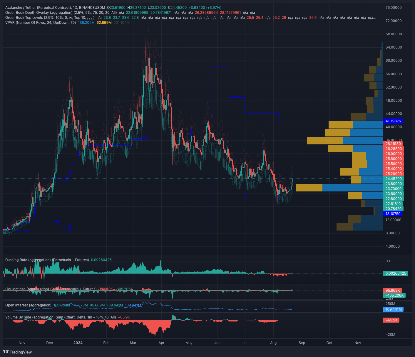 Spot alım hacimleri devam ederse veya uzun pozisyonlarda önemli bir artış olursa AVAX, 28 ila 33 dolar aralığındaki fiyatları takip etmek için (hacim profiline ve emir defterine bağlı olarak) 25 ila 27 dolar direnç kümesinin üzerindeki likiditeyi kaldırabilir.